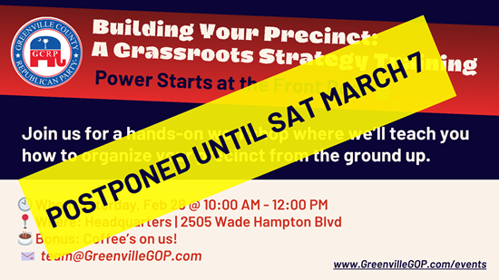 (#2) The ROM READDY event scheduled for MONDAY, March 2nd at the Hartness Hotel has also been postponed for unrelated reasons. It is being rescheduled for MONDAY, March 23rd at the same location. DETAILS COMING SOON.(#1) Given the bombings in Iran ... and the expected nation address by President TRUMP ... we are going to postpone today's Precicnt Training until next Saturday, March 7th, 10am- Noon. We will be at HQ monitoring the situation and answering any questions. (#2) The ROM READDY event scheduled for MONDAY, March 2nd at the Hartness Hotel has also been postponed for unrelated reasons. It is being rescheduled for MONDAY, March 23rd at the same location. DETAILS COMING SOON.0 Comments 0 Shares 80 Views 0 Reviews -