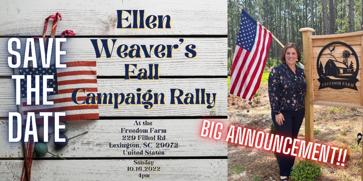 TOMORROW: ELLEN WEAVER FALL CAMPAIGN RALLY Sunday October 16, Republican nominee for State Superintendent of Education Ellen Weaver is hosting a fall campaign rally. TIME: 4 PM WHERE: Freedom Farm 229 Filhol Road Lexington, S.C. 29072 Food trucks will be present!